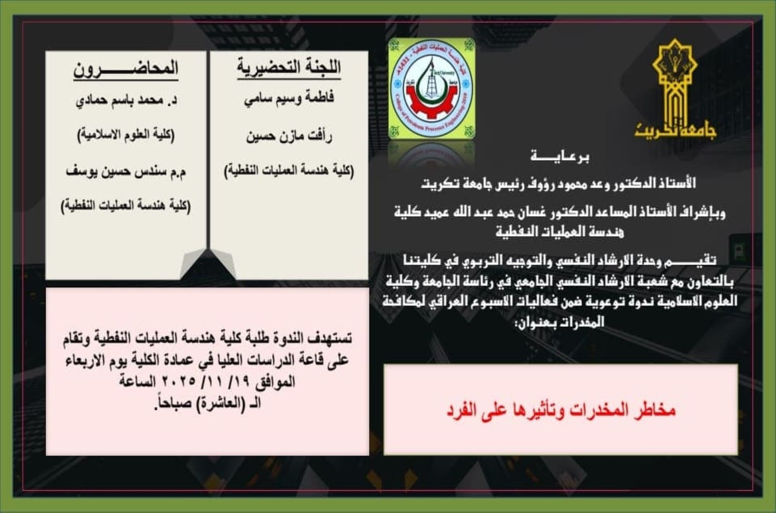 تعتبر كلية هندسة العمليات النفطية من الكليات الحديثة، حيث باشرت أعمالها سنة 2010م بإمكانيات بسيطة وكوادرقليلة جداً إلا أنّ منجزاتها التي أنجزت خلال هذه الفترة تعد منجزات عظيمة مقارنة بهذه الإمكانيات وقد شهدتتحديات كبيرة وعقبات عديدة استطاعت وبكل فخر أن تجتازها بثقة وإصرار على مواصلة المسيرة التعليمية في هذهالكلية وهي تسعى للصدارة محلياً بل وحتى عالمياً. هذا ويصب اختصاص كلية هندسة العمليات النفطية في مجال الصناعة التحويلية للنفط والصناعات الساندة لها وتتضمن قسمين هما: قسم هندسة تكرير النفط والغاز والذي يختص: بتكرير النفط الخام المستخرج من باطن الارض ومعالجة المنتجات النفطية بعد عملية التكرير، وقسم هندسة سيطرة المنظومات النفطية والذي يختص:بعمليات السيطرة المركزية وإدارة المنشآت النفطية. وتقدم الكلية برامج مختلفة من أجل اعداد الكوادر الهندسية عالية الكفاءة بتخصص القسمين. وتطمح الكلية الى التحسين المستمر من ناحية الكم والنوع لإنتاج جيل من المهندسين القادرين على خدمة بلدهم والمشاركة الفعالة في عملية البناء والتنمية الشاملة في جميع ميادين الحياة. وتسعى الكلية الى استحداث اقسام جديدة بتخصصات نادرة اخرى مثل هندسة النفط والغاز وهندسة الطاقات المتجددة التي تخدم المحافظة والبلد. |