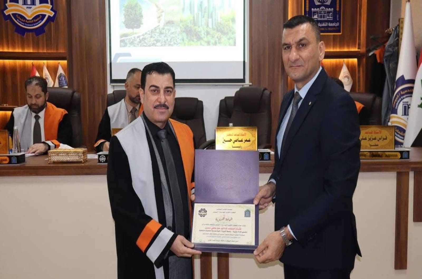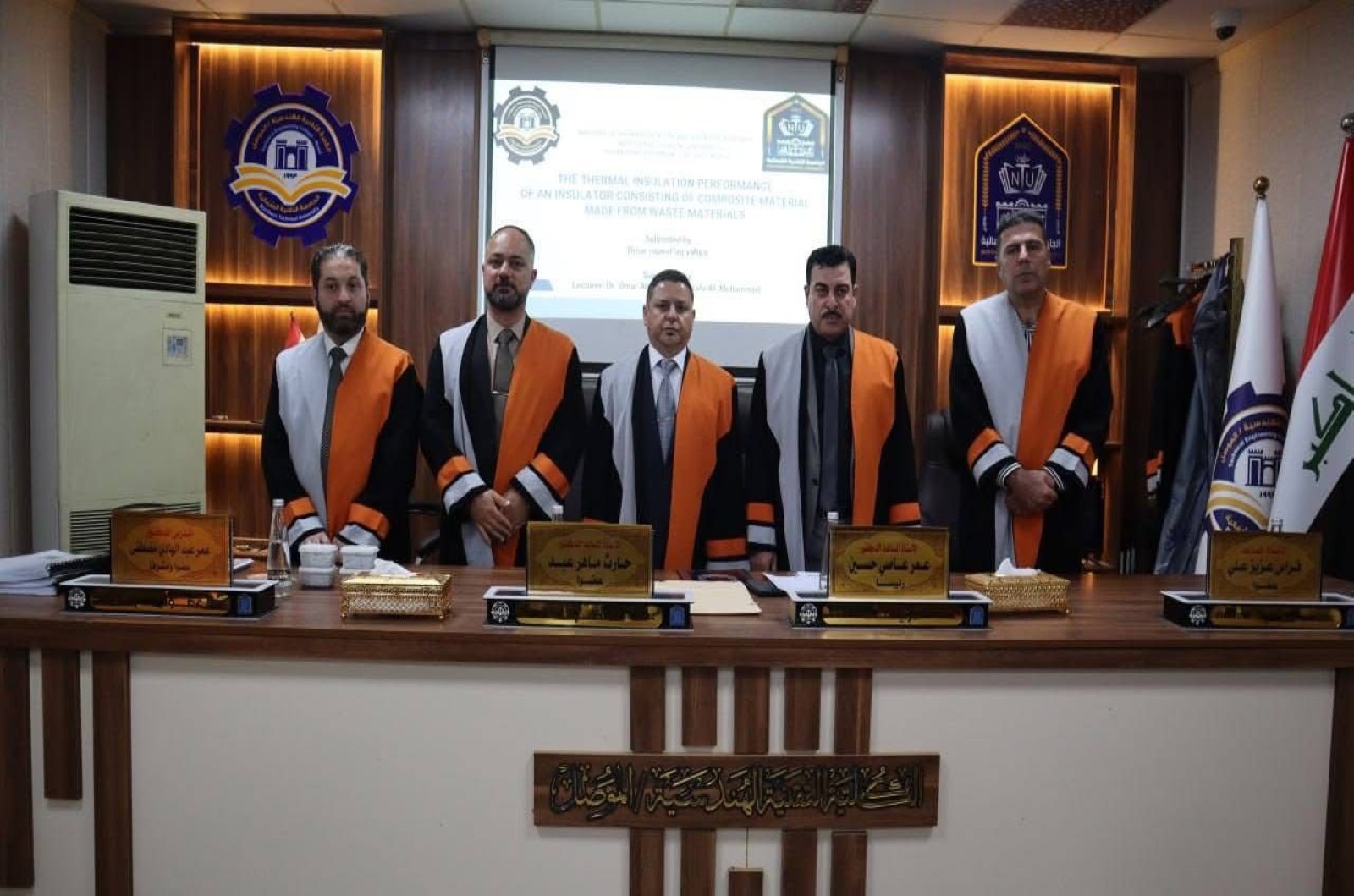 مشاركة تدريسي من كليتنا … شارك الاستاذ المساعد الدكتور عمر عاصي حسين برئاسة لجنة مناقشة رسالة ماجستير…الجامعة التقنية الشمالية تناقش أداء العزل الحراري للعازل المكون من مادة مركبة مصنوعة من مواد النفايات بحثت الكلية التقنية الهندسية / الموصل رسالة الماجستير التقني تخصص تقنيات هندسة الحراريات والموسومة:-